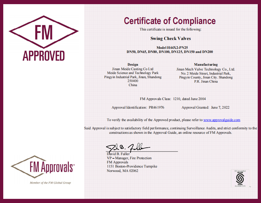 CHECK VALVES H44X2-PN25 DN50—DN200 from MEIDE GROUP are approved by FM.