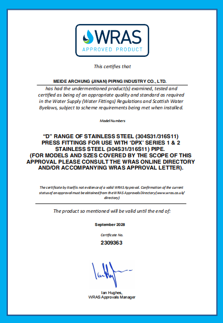 Meide Group wins WRAS certificate for SS Single Press Fitting and Pipe.