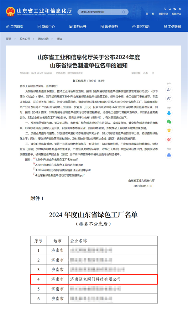 2024年8月22日,山東省工業(yè)和信息化廳發(fā)布《關(guān)于公布2024年度山東省綠色制造單位名單的通知》,經(jīng)單位申報(bào)、市工信部門(mén)審核推薦、專(zhuān)家評(píng)審論證、征求相關(guān)部門(mén)意見(jiàn)、社會(huì)公示等程序,玫德集團(tuán)旗下濟(jì)南邁克閥門(mén)科技有限公司順利通過(guò)審核,榮獲“山東省綠色工廠(chǎng)”。