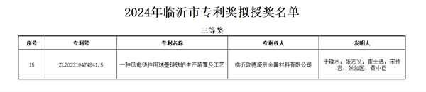 近日,臨沂市市場監(jiān)督管理局發(fā)布《2024年度臨沂市專利獎擬授獎項目公示》信息,臨沂玫德庚辰金屬材料有限公司的專利項目“一種風(fēng)電鑄件用球墨鑄鐵的生產(chǎn)裝置及工藝”榮獲臨沂市專利獎三等獎。這一榮譽不僅是對玫德庚辰在技術(shù)創(chuàng)新領(lǐng)域上的肯定,也是對公司研發(fā)實力和創(chuàng)新能力的高度認(rèn)可。
