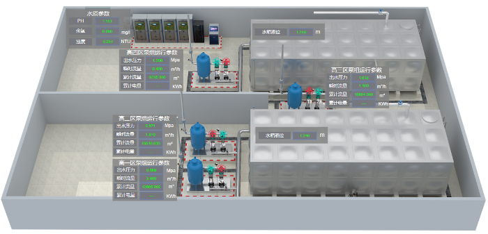 系統(tǒng)對(duì)泵房運(yùn)行態(tài)勢(shì)、門禁狀態(tài)和視頻監(jiān)控三維可視化管理,實(shí)現(xiàn)泵房全方位管控。通過(guò)系統(tǒng)可以全面監(jiān)測(cè)泵房各項(xiàng)指標(biāo)數(shù)據(jù),確保供水系統(tǒng)穩(wěn)定運(yùn)行。對(duì)采集的海量數(shù)據(jù)進(jìn)行深度處理和分析,實(shí)現(xiàn)泵房潛在故障及時(shí)預(yù)警。系統(tǒng)可以實(shí)時(shí)對(duì)供水?dāng)?shù)據(jù)進(jìn)行監(jiān)控,實(shí)現(xiàn)錯(cuò)峰調(diào)蓄??蓪⒈梅康臍v史數(shù)據(jù)和運(yùn)行情況進(jìn)行展示,為管理者決策提供精準(zhǔn)的數(shù)據(jù)支持,同時(shí)當(dāng)系統(tǒng)監(jiān)測(cè)到泵房異常時(shí),會(huì)自動(dòng)智能識(shí)別并發(fā)出警報(bào),使運(yùn)維人員快速響應(yīng),減少事故損失,實(shí)現(xiàn)風(fēng)險(xiǎn)快速感知、一站調(diào)度,及時(shí)解決問(wèn)題。