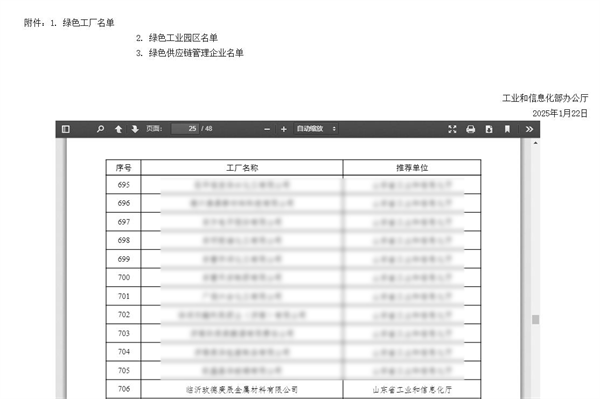 2025年1月23日,中華人民共和國(guó)工業(yè)和信息化部正式發(fā)布了《2024年度綠色制造名單通知》,臨沂玫德庚辰金屬材料有限公司(以下簡(jiǎn)稱“玫德庚辰”)成功入選國(guó)家級(jí)綠色工廠名單。與此同時(shí),臨沂臨港經(jīng)濟(jì)開發(fā)區(qū)也榮耀上榜,成為綠色工業(yè)園區(qū)的一員。這一喜訊標(biāo)志著玫德庚辰在綠色轉(zhuǎn)型道路上邁出了堅(jiān)實(shí)的一步,也為臨沂臨港經(jīng)濟(jì)開發(fā)區(qū)的綠色發(fā)展注入了新的活力。