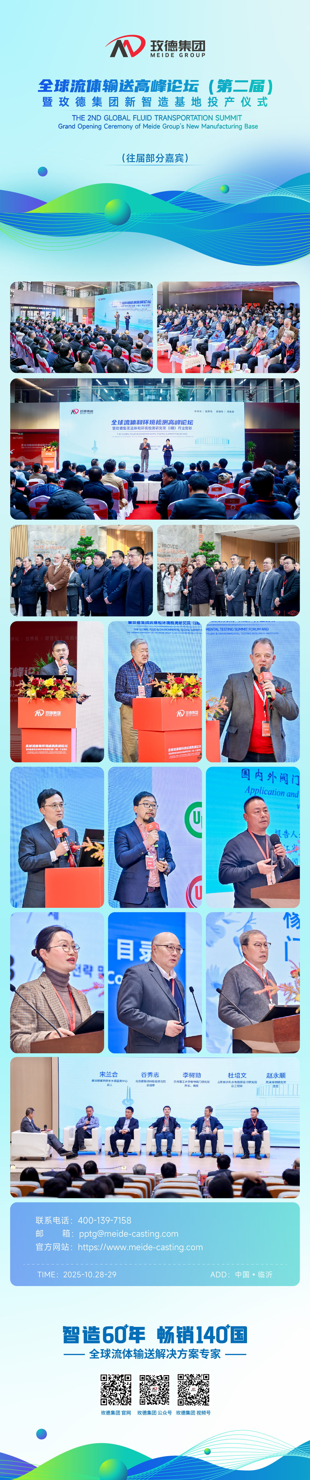 全球流體輸送高峰論壇(第二屆)暨玫德集團(tuán)新智造基地投產(chǎn)儀式將于2025年10月28日至29日在山東臨沂隆重召開!本屆論壇將邀請全球頂尖專家及學(xué)術(shù)骨干等300余人,匯聚行業(yè)智慧,共探前沿技術(shù)。論壇將聚焦市政、建筑、工業(yè)與電力等領(lǐng)域,圍繞行業(yè)政策、發(fā)展動態(tài)與未來展望開展深度研討,共同探討行業(yè)發(fā)展的新機(jī)遇與新挑戰(zhàn)。