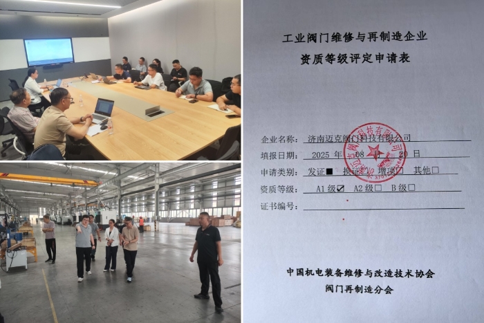 2025年8月20日,玫德集團(tuán)向中機(jī)維協(xié)閥門再制造分會(huì)提交了“工業(yè)閥門維修與再制造企業(yè)資質(zhì)等級(jí)評(píng)定申請(qǐng)表”,分別申請(qǐng)了:驅(qū)動(dòng)/自動(dòng)閥門、控制閥門、閥門驅(qū)動(dòng)裝置三個(gè)類別。2025年9月4日-5日,中機(jī)維協(xié)閥門再制造分會(huì)派遣專家評(píng)審組對(duì)玫德集團(tuán)進(jìn)行了運(yùn)維、維修與改造資質(zhì)現(xiàn)場(chǎng)評(píng)審。
