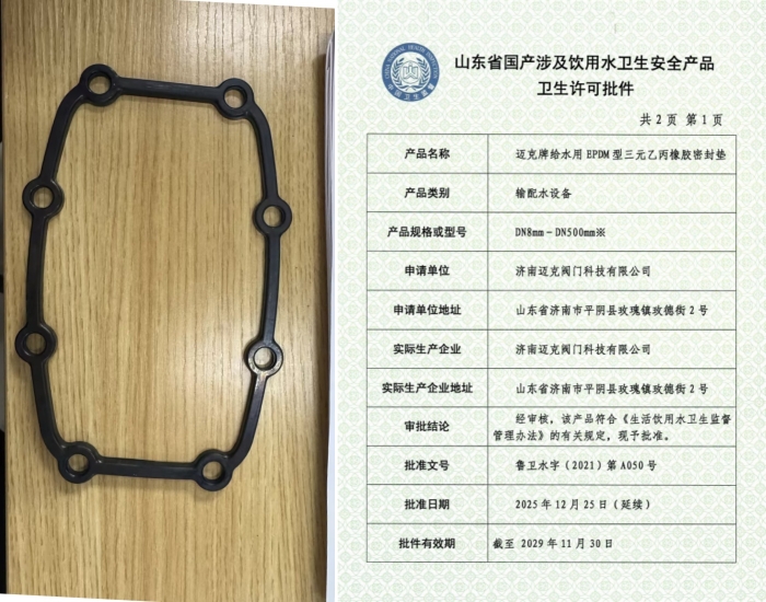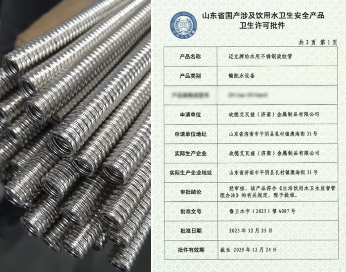 近日,玫德集團(tuán)旗下三類給水系列產(chǎn)品成功取得衛(wèi)生許可批件,標(biāo)志著集團(tuán)在民用及市政給水領(lǐng)域的合規(guī)性與安全性獲得權(quán)威認(rèn)可。本次獲批產(chǎn)品包括:玫德集團(tuán)有限公司生產(chǎn)的“邁克牌MCG智能罐式無(wú)負(fù)壓供水設(shè)備”、濟(jì)南邁克閥門(mén)科技有限公司生產(chǎn)的“邁克牌給水用EPDM型三元乙丙橡膠密封墊”以及玫德艾瓦茲(濟(jì)南)金屬制品有限公司生產(chǎn)的“邁克牌給水用不銹鋼波紋管”。