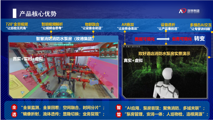 玫德智慧泵房四維空間融合系統(tǒng),依托人工智能、AR/VR及720°全景視頻技術(shù)深度融合,構(gòu)建起一套全方位、全流程、全維度的泵房智能管理體系,更是AR+全景視頻技術(shù)在流體輸送領(lǐng)域的首例實(shí)戰(zhàn)應(yīng)用,也是AI技術(shù)在水泵房場(chǎng)景中的首例深度應(yīng)用,開創(chuàng)了智慧消防水泵房場(chǎng)景應(yīng)用的新范式。